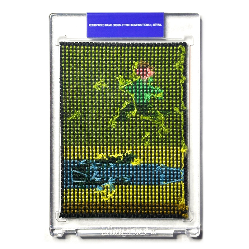 In the tradition of trading cards, these BYTE-sized handcrafted retro video game cross-stitch compositions are 1/1, encased, and brand sealed.